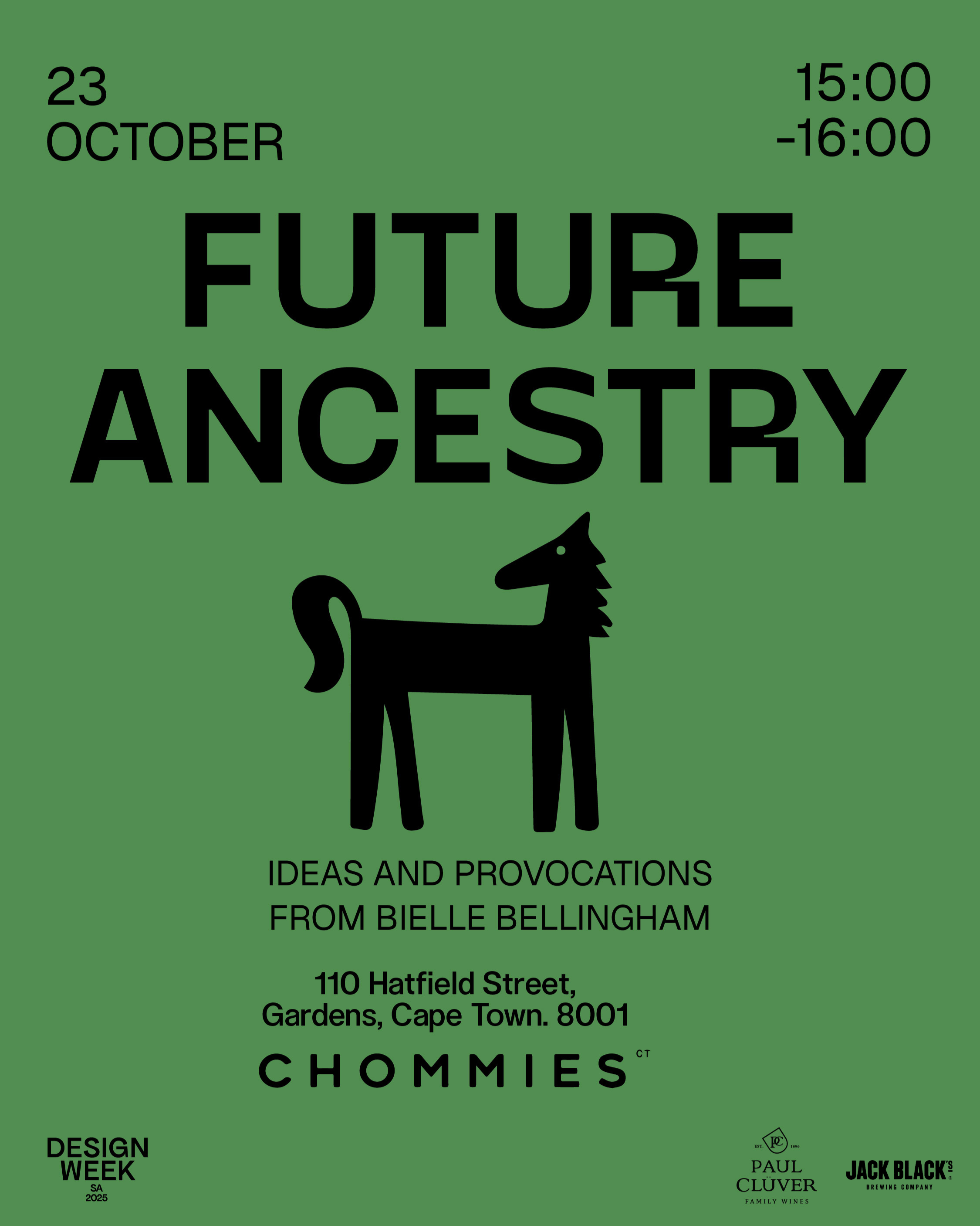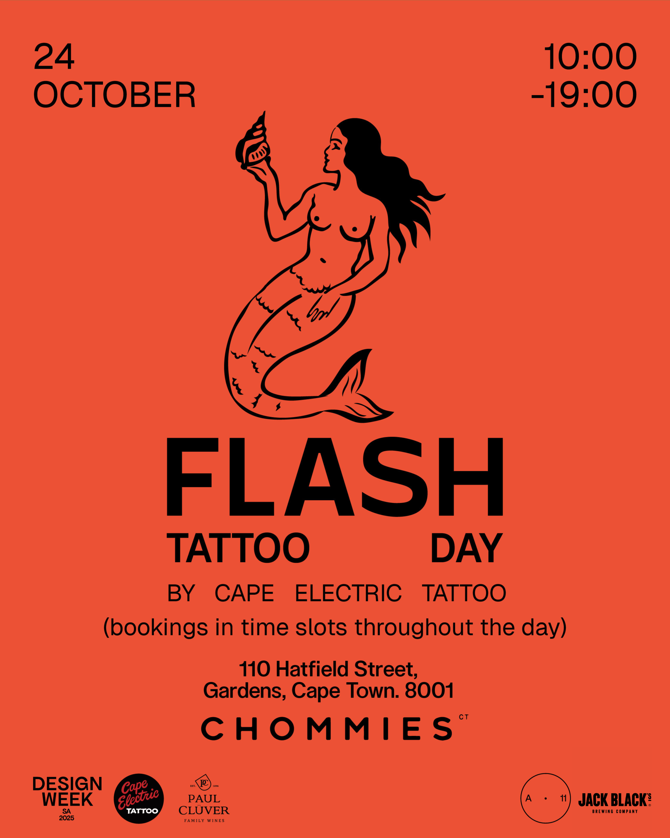 Design is a choice the world has to live with. Choose carefully. Make it powerful. Flash tattoos by Cape Electric Tattoo will be available throughout the day at Chommies. Walk in, book, and pay in person on the day. Free to attend, tattoos ranging from R1000 - R1800. Music from 4pm from A11.