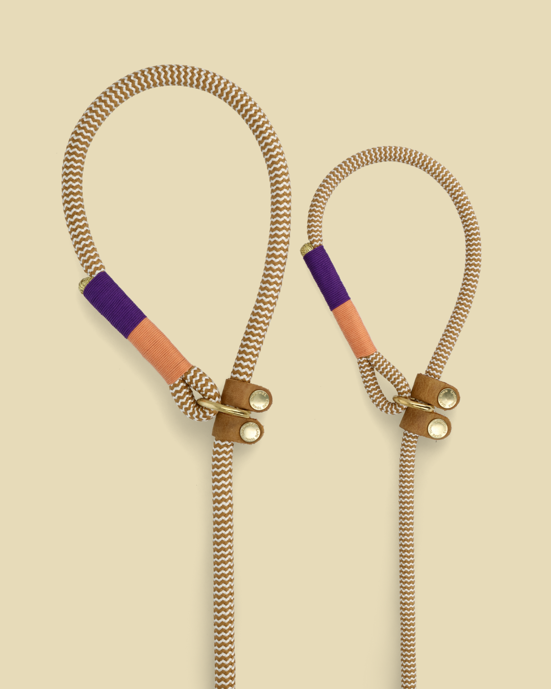 - Extra-long rope leashes with signature colourful whipping detail at both ends